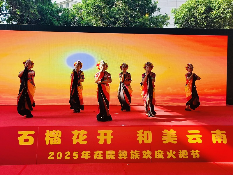 718(农历六月二十四),昆明市五华区西园北路76号楚雄大厦广场早已彩旗猎猎。“铸牢中华民族共同体意识——有一种叫云南的生活·石榴花开 和美云南”2025年在昆彝族火把节系列文艺活动,于当日午后两点正式启幕。广场上,悠扬乐声与翩跹舞步交织,早早便漾起了节日的欢腾。