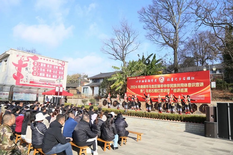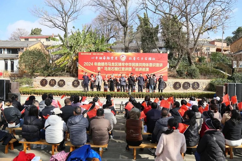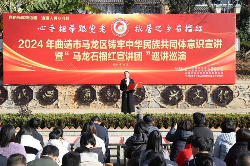 12月25日,马龙区在通泉街道土瓜冲村开展2024年铸牢中华民族共同体意识宣讲暨“马龙石榴红宣讲团”巡讲巡演活动。区政府副区长尹朝良出席活动,区委宣传部、区委统战部、区民宗局、通泉街道、杨官田社区干部职工,土瓜冲各族群众和来自五湖四海的旅居客共100余人参加。