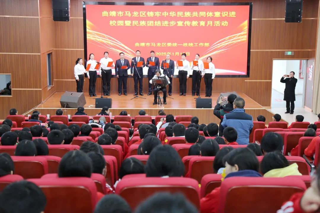 活动在歌伴舞《党旗飘扬的方向》中拉开序幕,铿锵有力的演唱鼓舞各族师生坚定信念,向着党旗飘扬的方向勇往直前。“中国辉煌,辉煌中国,今天就是辉煌的时刻。中国辉煌,辉煌中国,辉煌时刻会越来越多……”“我和我的祖国,一刻也不能分割,无论我走到哪里,都流出一首赞歌……”。700余名师生们随着《辉煌中国梦》《我和我的祖国》等歌曲的节拍一同高歌,将现场气氛推向高潮;马龙二中(职校)同学们带来精心编排的表演《彝家火塘情》,讲述了以“茶”促进各民族交往交流交融的故事;演讲与朗诵家协会准备的朗诵《写给未来的你》,勉励同学们要在青少年时期树立好正确的人生观、价值观,不断增强“五个认同”。九三学社曲靖市第九(马龙)支社全体社员们的小合唱和演讲与朗诵家协会艺术家带来的精彩节目,加深了各族师生对民族团结进步知识的了解,在各族青年学生心中播撒了铸牢中华民族共同体意识的种子。