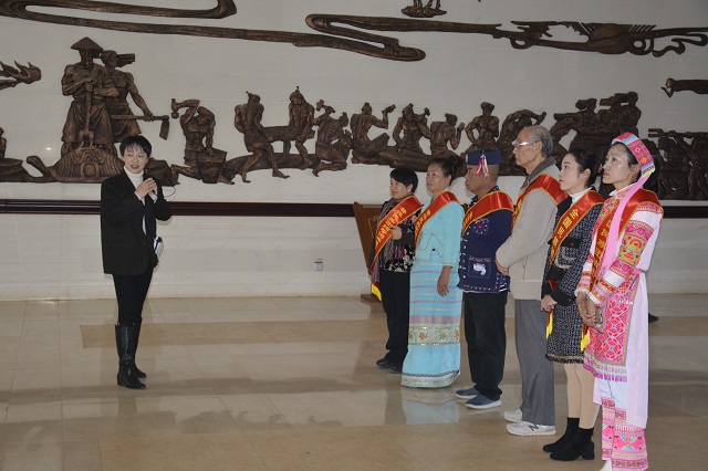 随后,代表们乘坐民族团结进步特色主题旅游车来到铸牢中华民族共同体意识体验馆,观摩了陈列展览厅内布设的民族团结誓词碑、段氏与三十七部会盟图等历史遗迹。