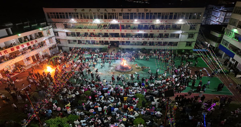 当夜幕吞下最后一缕霞光,毕摩手持松枝吟诵古谣,火种从圣火盆中跃出,顺着传递的火把连成火龙。瞬间,千支火把同时亮起,照亮了手牵手的人群——彝族的查尔瓦、苗族的百褶裙、傣族的筒裙在舞步中翻飞,踩着“八脚穿花”的非遗节奏,跌脚的声响像大地的心跳,将“中华民族一家亲”的暖意,烙进每个参与者的记忆。